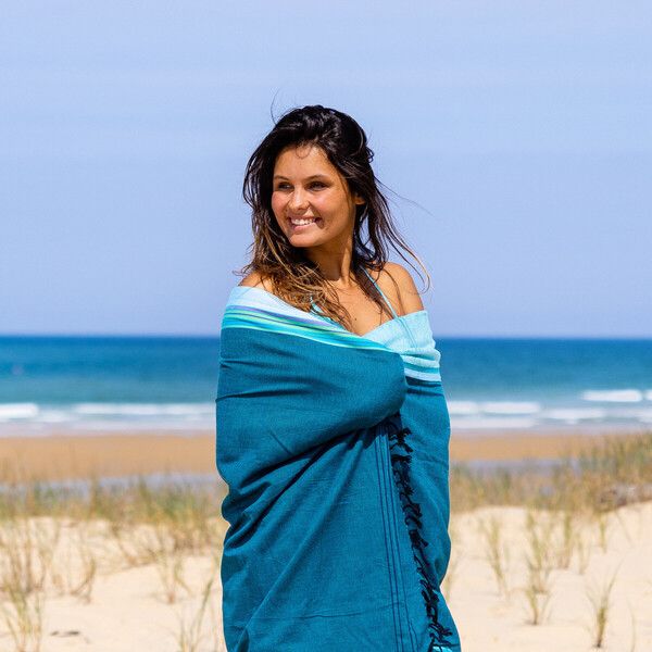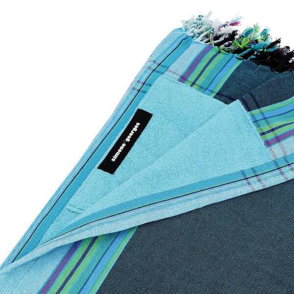 Es una toalla con un verde azulado intenso iluminado por un borde azul cielo, rayas turquesas, verdes y violetas y una esponja turquesa clara, magnífica.