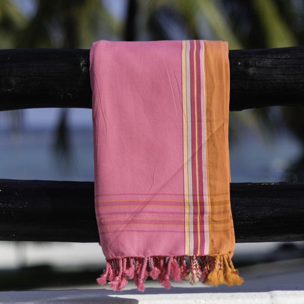 Diani, un balneario al sur de Monbasa, conocido por sus grandes playas de arena blanca y aguas turquesas. La toalla Kikoy que lleva su nombre luce un rosa fucsia con un borde naranja y un interior de felpa rosa para un efecto pop garantizado.